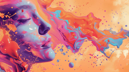 A striking portrait of a woman is set against an engaging backdrop of bold colors and abstract shapes. The artwork combines modern elements with vibrant details.