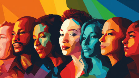 A vibrant and modern illustration featuring diverse female profiles in a colorful geometric design, showcasing unity and empowerment through art style and expression