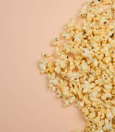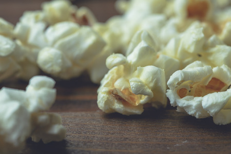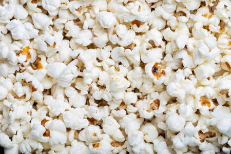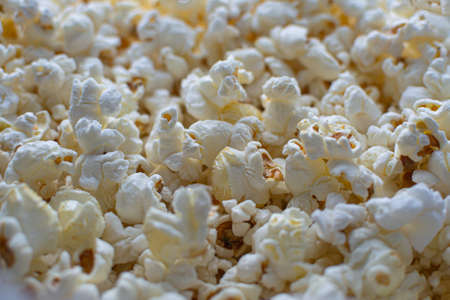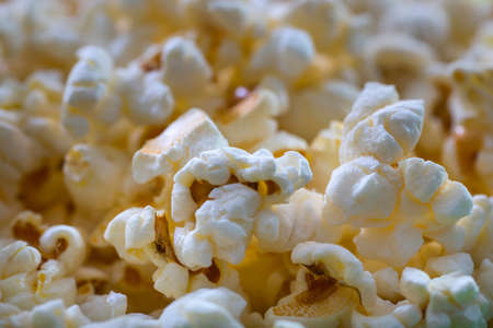Pile of popcorn closeup macro shot, selective focus, texture background.