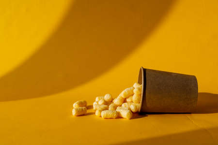 yellow corn sticks in a glass on a colored background, a full box of sweet corn sticks, a treat for children, yellow background, minimalism