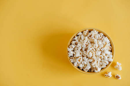 Popcorn in a yellow bowl on a yellow background. Top view. Copy, empty space for text.