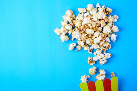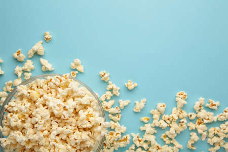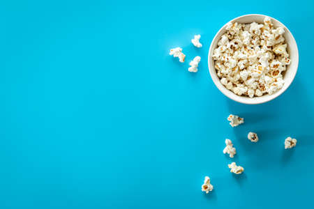Popcorn in a yellow bowl on a blue background. Top view. Copy, empty space for text.