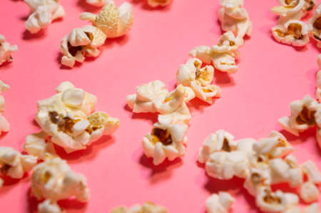 Close up of pieces popcorn on orange and violet background. Concept of food.