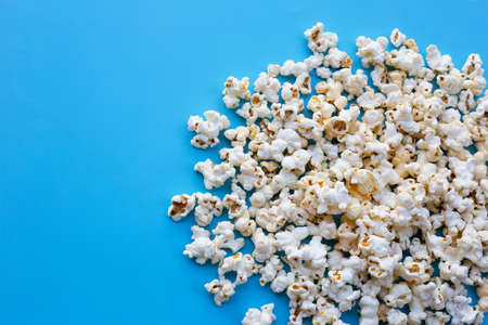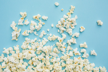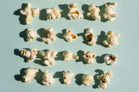 Rowes of salt popcorn on the light blue background. Concept of cinema or watching TV.