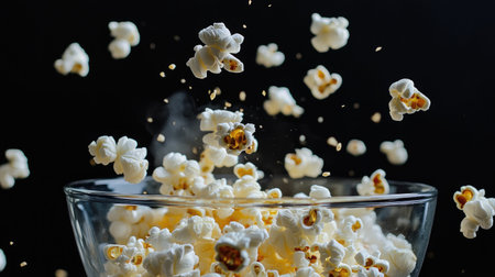 Close-up of popcorn popping in a clear glass bowl, with some kernels flying mid-air against a black background
