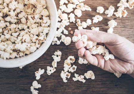 close-up of hand holding popcorn above wooden table with bowl and spilled popcorn