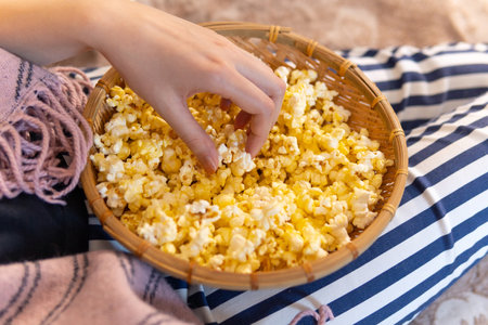 Delightful popcorn overflowing from a rustic wicker basket, ready for movie night.