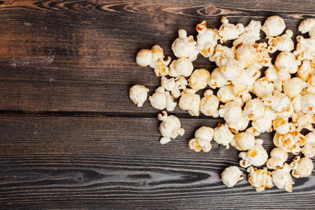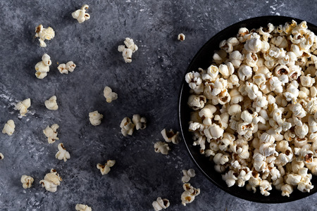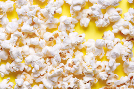 Popcorn on yellow background. Top view. Popcorn background. Popcorn Day