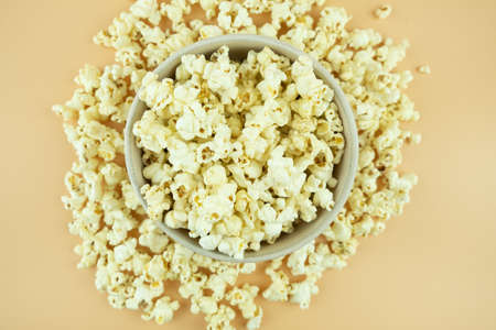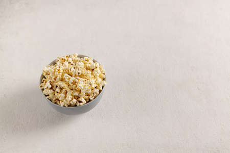 A bowl of delicious popcorn on a light background, natural delicious food for watching a movie
