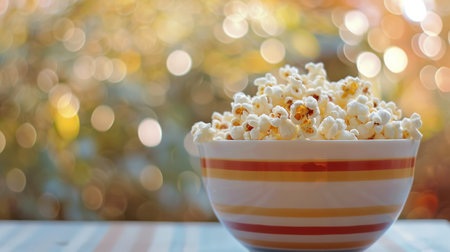 Popcorn is displayed in a striped bowl on the table, featuring a scenic background.