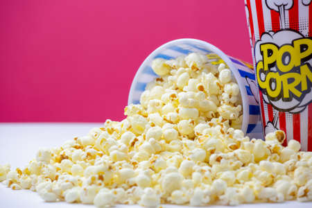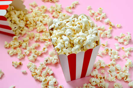 Airy popcorn in a striped paper cup and scattered on the table. Full box of popcorn.