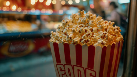 A box of freshly popped popcorn at the cinema, with blurred lights in the background.
