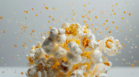 A close-up of popcorn kernels exploding with salt on a light background, creating a dynamic and appetizing scene. Ideal for snack, cinema, and food themes.
