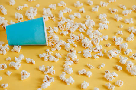 Popcorn in a blue paper cup scattered on a yellow background. Minimalist concept. Copy, empty space for text.