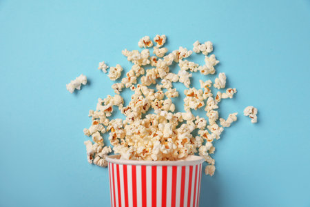 Fresh tasty popcorn and paper cup on light blue background, flat lay