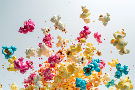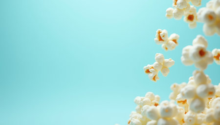 A playful image of popcorn floating mid-air against a light blue background, creating a whimsical and lighthearted mood. The image suggests fun, snacks, and casual enjoyment.