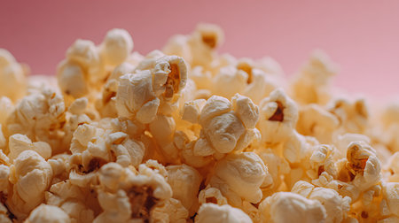 The image showcases a delectable close-up of a generous pile of freshly popped popcorn against a soft pink background. The popcorn texture is fluffy, light, buttery and ready to eat.