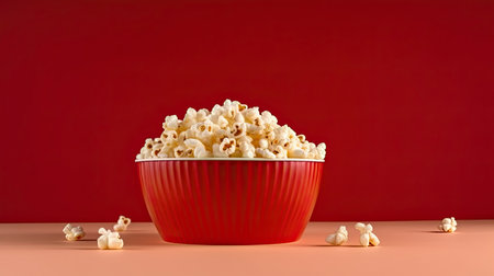 Delicious Popcorn in Red Bowl on Vibrant Blue Background.