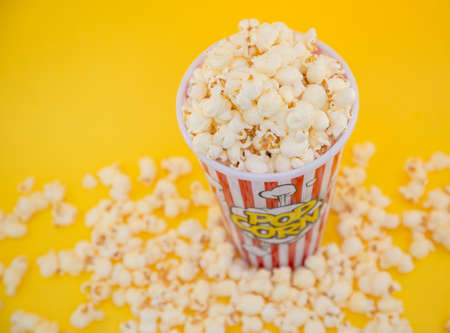 Butter popcorn in a red popcorn cup, snack in the house or cinema on a yellow background
