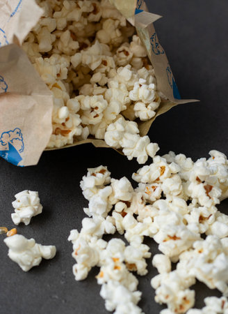 Fresh popcorn in bag made in a microwave on grey kitchen table