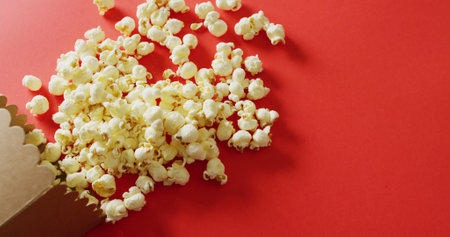 Image of close up of popcorn on red background. Food, party and copy space concept.