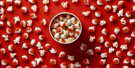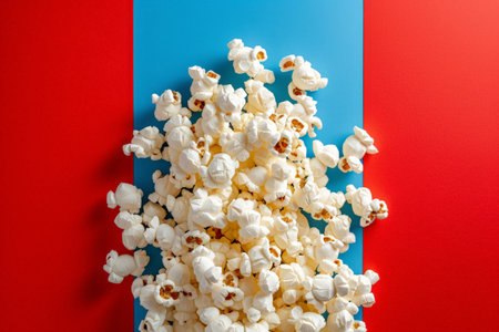 Top View of Popcorn on Red, Blue and White Striped Background, Snack Food Concept, Movie Night, Cinema Theme, Festive Carnival Snack Display