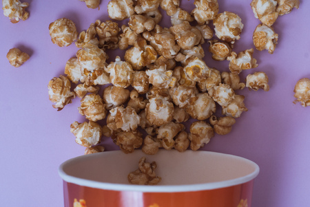 Popcorn in a paper Cup on a purple background, healthy snack junk food