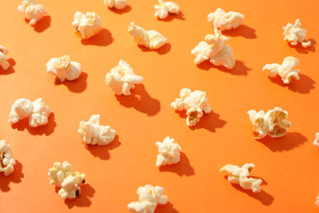 Close up of pieces popcorn on orange and violet background. Concept of food.