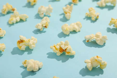 Rowes of salt popcorn on the light blue background. Concept of cinema or watching TV.