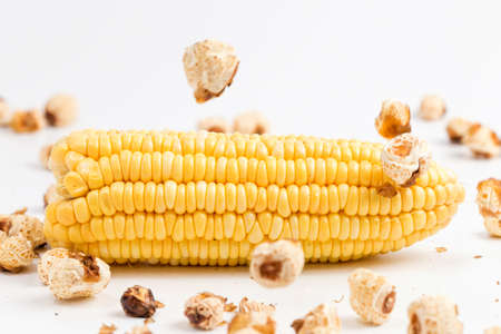 Organic Popcorn Kernels seeds macro portrait, yellow background