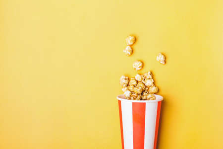 Movie time. Cardboard bucket of popcorn on yellow background. Top view