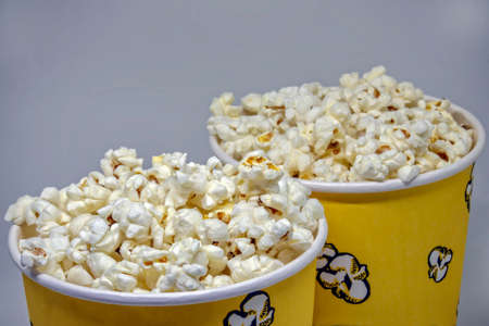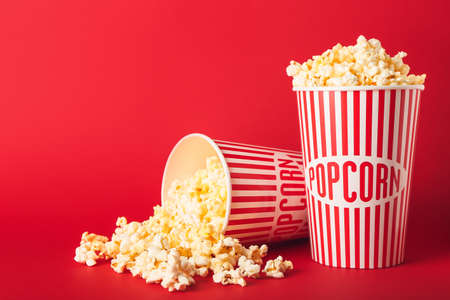 Butter popcorn in a red popcorn cup, snack in the house or cinema on a yellow background