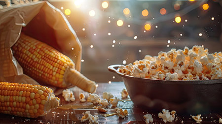 a wooden background adorned with freshly popped popcorn and golden corn kernels, oil and a captivating cornucopia centerpiece, evoking a sense of abundance and harvest