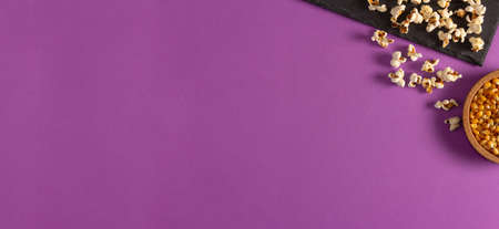 Popcorn on slate tray and corn seeds on purple background. Flat lay. Copy space. Home movie time.