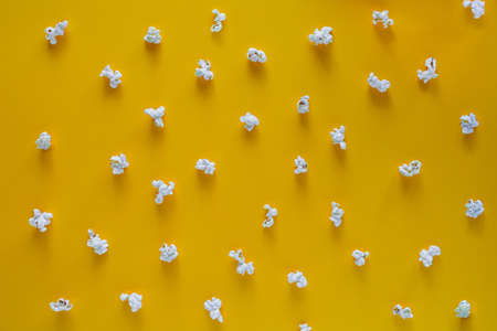 Popcorn pattern on yellow background. Top view. Film. Fast food. Corn.