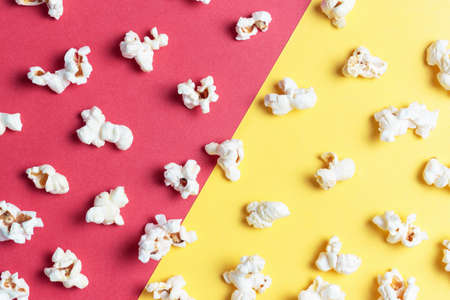Popcorn pattern on yellow background. Top view. Contrast concept. popcorn on color background
