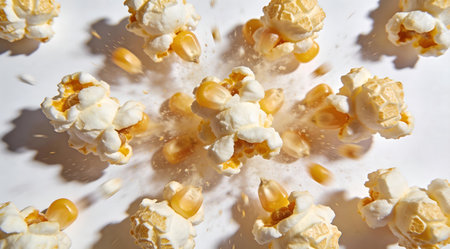 Delicious popcorn pieces leap and scatter, bringing a cheerful vibe and playful atmosphere