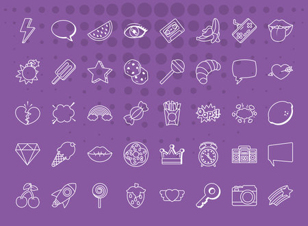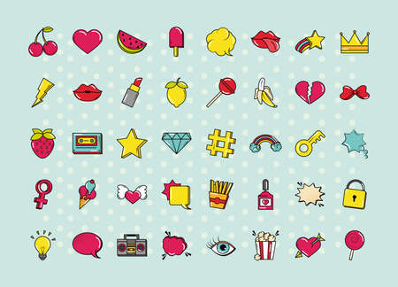 pop art comic style, funny fashion stickers kit, flat icons set vector illustration