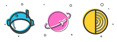 Set Astronaut helmet, Planet and Earth structure icon. Vector