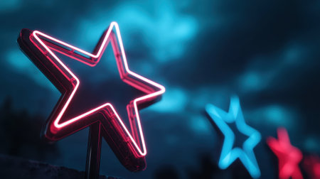 A row of neon stars are lit up in the dark sky. The stars are red and blue, and they are arranged in a row. The scene has a festive and celebratory mood, as if it is a special occasion or event