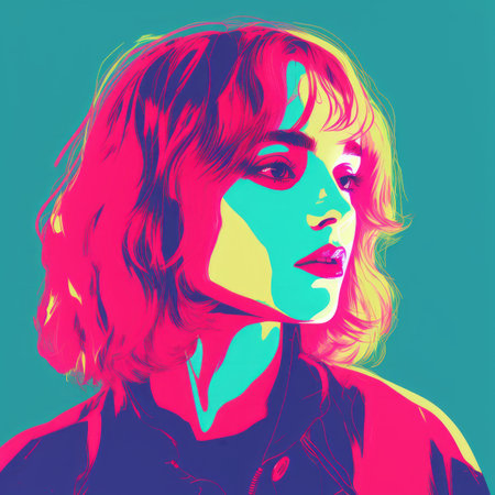 Vibrant pop art style portrait of a woman's face with bold colors and patterns