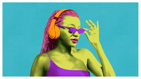 Woman with orange headphones and purple glasses posing in retro futurism composition. Concept of diversity, cultural identity, lifestyle promotion, digital learning, and creative advertising visuals.