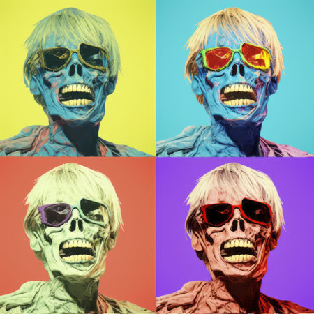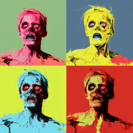 pop art zombie face in various colors, showcasing neo-pop iconography. candid shots of renowned personalities captured in holotone printing and solarization techniques. embracing figurative neo-expressionism, figurative expressionism, and digital neo-expressionism. ai generated