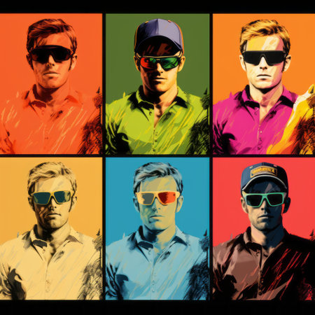 pop art portrait of a man wearing sunglasses, featuring tonal variations in color. this vibrant artwork captures the essence of youthful protagonists and incorporates multiple screens, reminiscent of an associated press photo. created by kombuchapunk, the piece showcases a warm tonal range and is part of a group material. ai generated