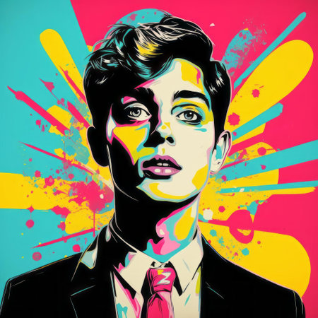 the vibrant man in this pop art portrait exudes confidence, surrounded by bold colors and abstract shapes, blending modern art styles with a touch of retro flair, creating a striking visual representation of contemporary masculinity and artistic expression. ai generated