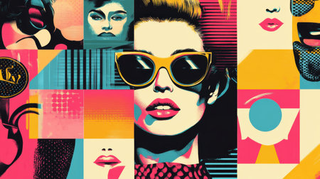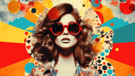 A vibrant pop art collage showcases a woman wearing stylish sunglasses, surrounded by bold colors and abstract patterns, capturing a retro aesthetic.