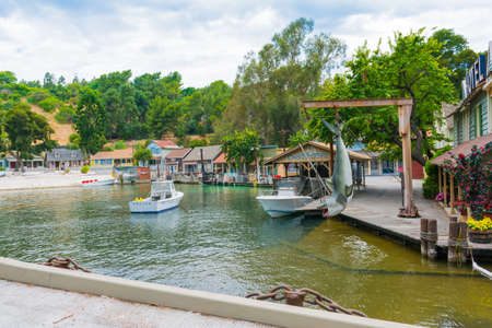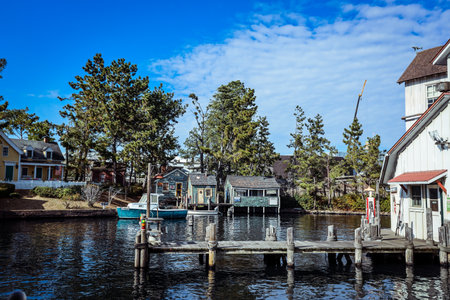 Osaka, Japan - January 11, 2020: Streets of Amity Village with the wooden harbor and River in the Universal Studio Japan