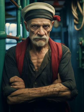 Close-up portrait of an elderly man with a white beard and weathered face, wearing a hat. Photorealistic style, harbor background. Concept of wisdom and experience