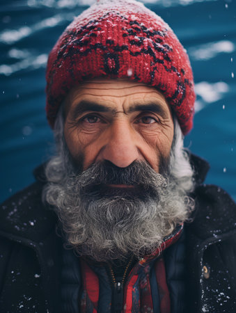 Portrait of an old man with a long gray beard and mustache in a red hat on a background of blue water in winter