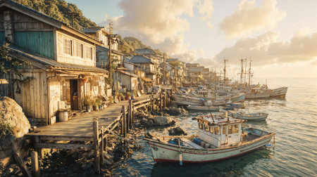 Picturesque traditional Japanese fishing village with wooden houses and colorful boats moored in tranquil harbor at golden hour sunset light.